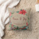 Winter rustic watercolor elegant Merry Christmas family Peace & Joy throw pillow featuring coral red, burgundy, and green floral wreath with seasonal poinsettia, pine cones, fir branches, holly berries, cardinal birds and foliage, and a modern handwriting typography script over a faux burlap beige cloth background. +++++++++++++++++++- Personalise it with your family name and text on both sides!