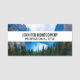 A name tag with a beautiful photograph of a pleasant and tranquil nature scene. Vibrant green forest in the front and shadowy blue mountains in the back. With a dreamy cloudy white sky. Misty and magical feel. perfect for outdoorsy professions.