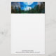 Stationery paper with a beautiful photograph of a pleasant and tranquil nature scene. Vibrant green forest in the front and shadowy blue mountains in the back. With a dreamy cloudy white sky. Misty and magical feel. personalise with a name and address.