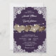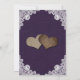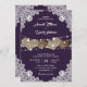 These romantic rustic wedding invitations featuring burlap hearts against a burlap and lace background adorned with string lights are perfect for inviting your guests to your purple rustic country/barn wedding party.