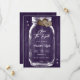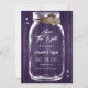 Personalised purple rustic mason jar wedding save the date cards featuring a mason jar and burlap hearts against a barn wood background adorned with twinkle lights. Easily personalise online. Matching items available to complement these purple wedding save the dates.