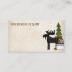 This rustic country business card design features a silhouette moose standing with a pine tree and country decor.