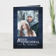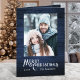 Rustic country style holiday flat cards with "Merry Christmas" along with your personalised family name or names and the year in farmhouse holiday typography. The front of the card features your personal photo highlighted by a rich coloured blue wood plank background print. Inside the card features a text space for your personal holiday message. Available in high quality printed card stock for standard mailing or a downloadable, digital format for quick and easy sending via text message, email or even self print.