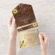 Join us for an elegant celebration in the heart of the countryside, where vintage wood meets rustic sunflowers and bohemian floral lace, all illuminated by twinkling string lights and adorned with monogram at the top and gold accents. Add your RSVP, wedding website, than seal and send!