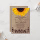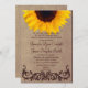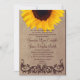 The background is a distressed vintage paper print with a slightly textured look. It has an ornate floral vine scroll print at the bottom of the invitation. The top of the invitation features a large bright yellow sunflower with beautiful yellow flower petals. These rustic sunflower wedding invitations are perfect for country weddings, barn weddings, farm weddings, cowboy weddings, rustic weddings, and anyone who is using sunflowers in their wedding bouquet or wedding reception decor.