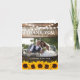 Rustic wedding thank you card featuring a country barn oak barrel background, a photo of you on your wedding day, twinkle string lights, golden sunflowers, your names, and the wedding date.