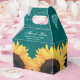 Custom rustic teal wedding favour box featuring a teal burlap background with sunflowers. Easily personalise this teal floral favour box with your event details.