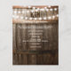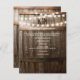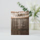 Rustic country wedding information card featuring a country barn dark oak barrel background, twinkle string lights, your monogram and a editable modern wedding template.