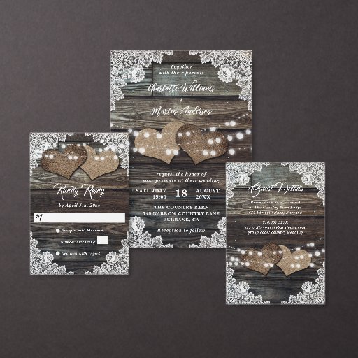 You can slip this rustic country-themed card into your wedding invitations to let out of town guests know of any hotel arrangements or group codes. Easy to personalise template. Matching items available. Rustic country wedding enclosure card featuring two burlap hearts against a barn wood background adorned with string lights and white floral lace.
