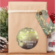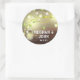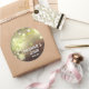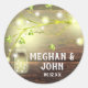 Rustic country wedding wood mason jar string of lights tree branch with green leaves wedding round sticker. These can be used as rustic wedding favour stickers, wedding envelope seals, and more. The glowing string of lights illuminate the green leaves against a beautiful rustic dark brown wood. This rustic wedding design is customisable and perfect for your beautiful outdoor country wedding or western wedding.
