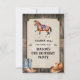 Saddle up and gallop over for a fun horseback riding themed birthday party. A wood plank background suggests the interior of a stable with a panel held on by burlap straps. The cream-coloured panel has a horse watermark. At the top, a horse is saddled up to thank guests for taking part in a fun day with horses. A pair of cowboy boots and a cowboy hat are placed towards the bottom of the card with western-style ornaments accenting the design. Available with matching products.