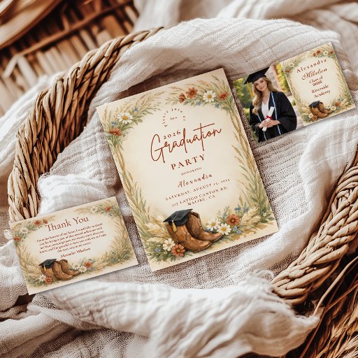 Celebrate your graduate with a warm western-inspired design featuring classic cowgirl boots, a graduation cap detail, and delicate wildflowers woven through soft prairie grasses. The earthy neutral palette of beige, sage, dusty blue, and warm terracotta creates a refined ranch aesthetic that feels both modern and timeless. Ideal for country-loving grads, rodeo girls, or anyone who feels at home under open skies. A balanced blend of rustic charm and elegant botanical detail for a memorable celebration.