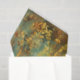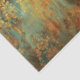 This is an ornate, decorative pattern in shades of gold, turquoise, and rust. The design features intricate, symmetrical damask or arabesque motifs that resemble stylised acanthus leaves, scrolls, and floral elements arranged in vertical columns. The patterns have a distressed, weathered appearance with faded and worn areas, revealing turquoise and rust underneath the gold top layer. This aged patina effect gives the design an antique or vintage feel.