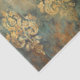 This is an ornate, decorative pattern in shades of gold, turquoise, and rust. The design features intricate, symmetrical damask or arabesque motifs that resemble stylised acanthus leaves, scrolls, and floral elements arranged in vertical columns. The patterns have a distressed, weathered appearance with faded and worn areas, revealing turquoise and rust underneath the gold top layer. This aged patina effect gives the design an antique or vintage feel.