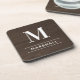 This simply elegant custom monogrammed beverage coaster set features classic white monogram text that can be personalised with a last name initial and last name. A beautiful keepsake gift for a newlywed couple, family, or new homeowners. A dark walnut brown faux wood grain background adds a rustic textured look to the design.