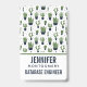 A badge with a rustic western flavour. Designed with a bunch of cute green cactuses in a repeating pattern. Specifically, green coloured prickly cactus, in all kinds of shapes and sizes, each sitting in its own dark blue flower pot. Little decorative triangles in between them. Personalise with your name and profession.