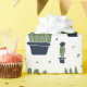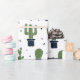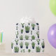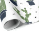 Wrapping paper with a rustic western flavour. Designed with a bunch of cute green cactuses in a repeating pattern. Specifically, green coloured prickly cactus, in all kinds of shapes and sizes, each sitting in its own dark blue flower pot. Little decorative triangles in between them. Whimsical fun illustration.