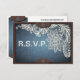 This wedding RSVP card features a leather look background topped with blue denim and a delicate ivory lace graphic design. Modern and chic. Easily customised. ::ENVELOPES INCLUDED::