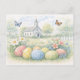 This peaceful watercolor postcard features a charming countryside church surrounded by a blooming spring meadow, delicate flowers, and beautifully decorated Easter eggs. Soft butterflies and a light pastel palette create a calm, uplifting atmosphere that reflects the true spirit of Easter.