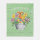 This personalised floral Easter themed fleece blanket features a rustic design of a white basket of yellow and purple spring flowers and Easter eggs in shades of yellow, purple, green and turquoise with your family name in white typography on a faux green weathered wood background. Designed by world renowned artist ©Tim Coffey.