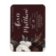 Celebrate your special day with this warm and elegant floral wedding magnet, a beautiful keepsake for your guests. Featuring deep burgundy, ivory, and soft blush blooms with delicate greenery and gold accents, this design is both timeless and romantic. The rich burgundy background creates a sophisticated, inviting feel, perfect for autumn, winter, or rustic-inspired weddings. A blend of modern script and classic serif fonts adds an elegant touch, ensuring your details stand out. Whether for a vineyard wedding, barn reception, or intimate garden ceremony, this magnet is a stunning way to announce your love story.