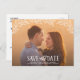 This pretty, rustic-chic photo save the date postcard template features an elegant floral frame along the top of the card, the phrase "Save the date" written in hand lettering and calligraphy, and a full-bleed photo.
