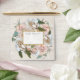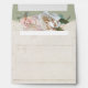 Square sized envelope. Lovely soft off white rustic wooden shiplap board background with elegant, hand painted rose floral wreath. Wild roses in colours varying from cream to blush pink to peach for a romantic finish to your invitation suite. Your preprinted return address is on the back flap and the interior has a mint sage green with the flower pattern repeated. Art copyright Audrey Jeanne Roberts, all rights reserved.
