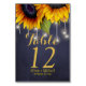 Rustic summer or autumn elegant wedding table number with editable text featuring big sunflowers and strings of twinkle lights on dark midnight navy blue chalkboard background. Ideal for your summer night or autumn fall | garden | elegant rustic country | outdoor backyard themed wedding.