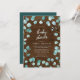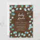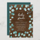 This rustic baby shower invitation features eucalyptus leaves with the words "baby shower" in trendy script all against a brown wood background on the front and a dark teal green colour back side.