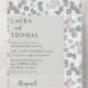 Get inspired by this lovely rustic watercolor design. Featuring sage green eucalyptus with a touch of dusty pink arranged in a pattern. This invitation is a great way to send all your details in one easy to use format. All you need to do is change the text to your personal requirements, then you guest can detach the rsvp information and send back. So easy and convenient.