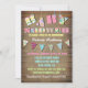So cute! Rustic baby girl, baby shower invitations with the words "baby shower" and banners made out of different fabric inspired designs against a faded brown striped background. Please contact me with any problems or changes!