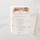 The design on the party game is attractive and very sturdy. It is made from heavy card stock. It is larger than it appears on line. Very happy with this product. The lettering on the this wedding game is large and clear. No need to wear glasses to read the questions.