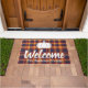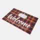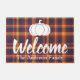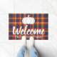 Beautiful bold fall hues plaid doormat featuring the word "welcome" in thick white script and your family's name.