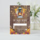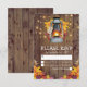 Rustic country wedding response cards featuring a wooden barn background, autumn leaves, a candle lit lantern, string twinkle lights and a modern rsvp template.