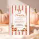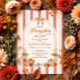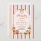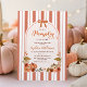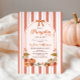 Celebrate your little pumpkin on the way with this charming baby shower invitation for a girl. Featuring whimsical pumpkins with a sweet bow, surrounded by pink, orange, and burnt orange flowers, and set against a striped burnt orange background, this fall-themed design blends boho and coquette style for the perfect seasonal celebration. Personalise with your party details to create a keepsake guests will love.