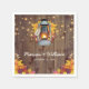 Rustic country fall napkins featuring a wooden barn background, autumn leaves, a candle lit lantern, string twinkle lights and a modern text template.