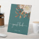 Rustic Fall Teal Pedestal Sign. Encourage guests to leave a note of love and memories with this beautifully coordinated guest book tabletop sign. Designed with a rich teal background and adorned with hand-painted watercolor artwork featuring burnt orange and terracotta leaves, cream and beige dahlias, and coppery roses, it complements your fall wedding décor with ease. Elegant and compact, it adds a warm, seasonal touch to your guest book station. Personalise the message and invite guests to share something meaningful with you.