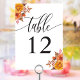 Elevate your autumn wedding reception with these charming table numbers. Featuring a delicate watercolor floral design in warm hues of orange, yellow, and red, these cards evoke the beauty of fall foliage. The rustic background adds a touch of natural charm, creating a warm and inviting atmosphere for your guests.