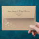 Boho-rustic wedding envelope featuring a faux wood grain interior liner with string lights and golden floral lace on the exterior. Perfectly matches fall or barn wedding themes, this envelope adds a warm, elegant finishing touch to your invitation suite. Customise with your return address for a cohesive and personalised presentation. Coordinates with the Rustic Wood String Lights Wedding Suite.