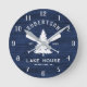 This rustic personalised family name lake house wall clock features a pine tree on crossed oars on a navy blue wood background.