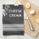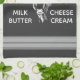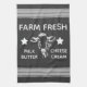 Rustic dark grey and white farm fresh dairy cow kitchen towel featuring stars and the words "milk butter cheese cream".