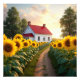 A picturesque scene of a quaint white farmhouse with a red roof nestled within a vibrant sunflower field at sunrise.
