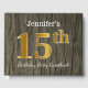This guest book design features the ordinal number "15th" with a faux gold-like appearance. It also features a custom name, and a rustic faux wood appearance background. It could be used at a party for somebody celebrating their fifteenth birthday. [~Z0000053]