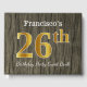 This guest book design features the ordinal number "26th" with a faux/imitation gold-like appearance. It also features a personalised name, and a rustic faux wood look background. It could be used at a party for somebody celebrating their twenty sixth birthday. [~Z0000053]