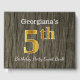 This guest book design features the ordinal number "5th" with a faux gold-like appearance. It also features a custom name, and a rustic faux wood appearance background. It could be used at a party for somebody celebrating their fifth birthday. [~Z0000053]
