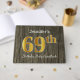 This guest book design features the ordinal number "69th" with a faux/imitation gold-like appearance. It also features a customised name, and a rustic faux wood look background. It could be used at a party for somebody celebrating their sixty ninth birthday. [~Z0000053]