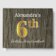 This guest book design features the ordinal number "6th" with a faux gold-like appearance. It also features a personalised name, and a rustic faux wood appearance background. It could be used at a party for somebody celebrating their sixth birthday. [~Z0000053]