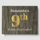 This guest book design features the ordinal number "9th" with a faux gold-like appearance. It also features a custom name, and a rustic faux wood look background. It could be used at a party for somebody celebrating their ninth birthday. [~Z0000053]