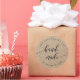 Rustic round sticker featuring the words "hand made" in a relax cursive script in dark grey against a faux kraft pattern background.