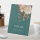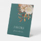Rustic Favours Pedestal Sign. Guide guests to your thoughtful take-home gifts with this autumn-inspired favours tabletop sign. Featuring the signature Teal Terracotta Fall Leaves Floral Collection artwork—burnt orange and terracotta leaves, beige dahlias, and copper roses over a teal backdrop—this sign blends beautifully with your décor while adding function to your favour display. Customise the wording and make your final send-off just as charming as the rest of your day.